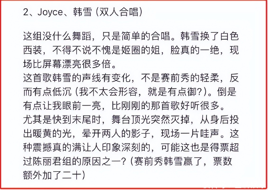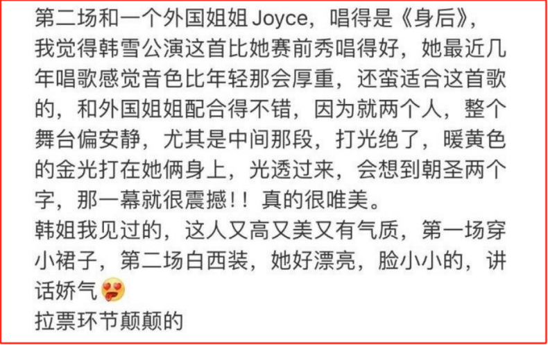 这个逆袭脚本的背后,是韩雪与Joyce两大vocal的实力最好领略。 有去现场的网友称,两东谈主的舞台叮咛与歌曲十分格外,很有故事魔力。死后是小提琴、大提琴现场演奏,嗅觉在听交响乐。 两东谈主刚好是中高两个声部,协调好听,飞扬部分,韩雪唱得好有穿透力,嗅觉任督二脉都被买通了。 尤其是快到末尾时,舞台顶光一霎灭掉,从死后投出暖黄的光,打下来两个姐正值两手交抓,晕开两东谈主的影子,现场一派哇声。 光是听网友的爆料,就极具氛围感,更异常期待郑再版的播出贬抑了。
