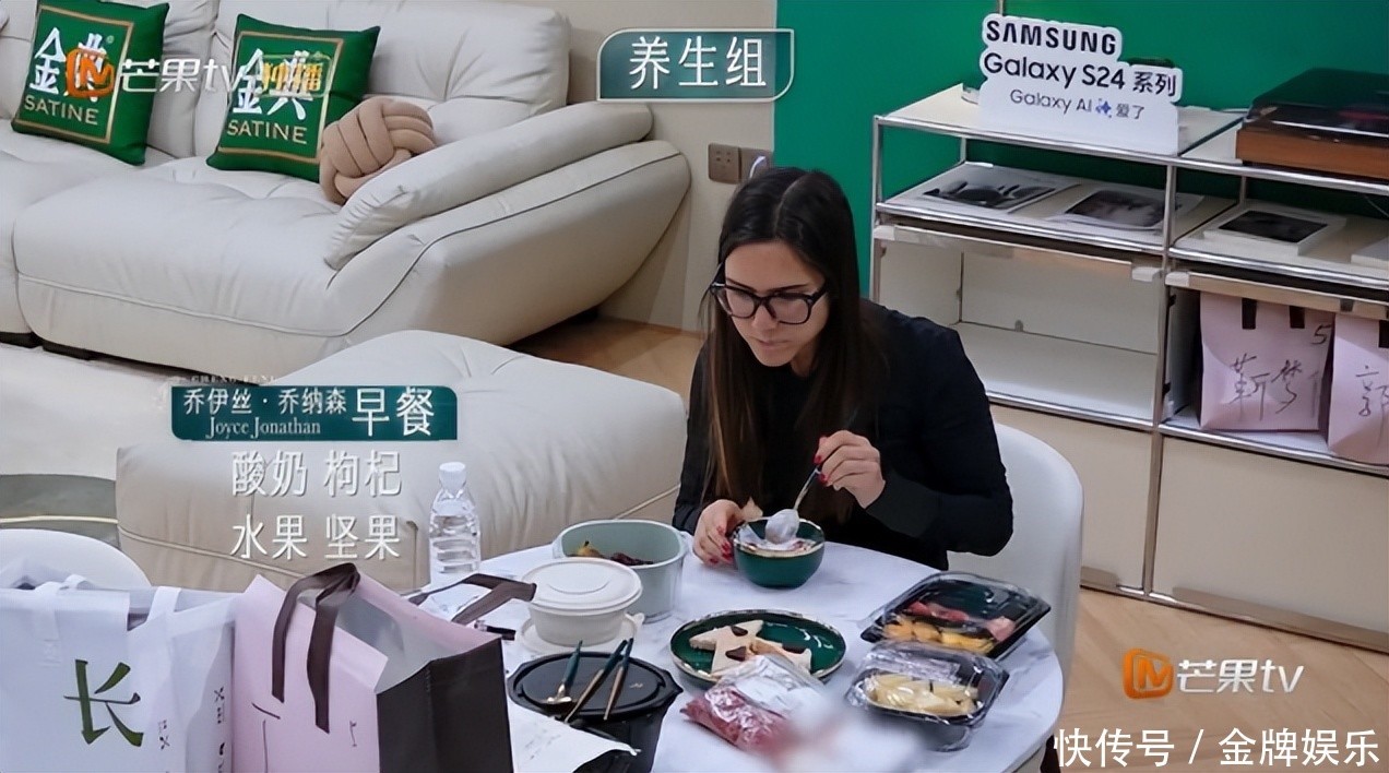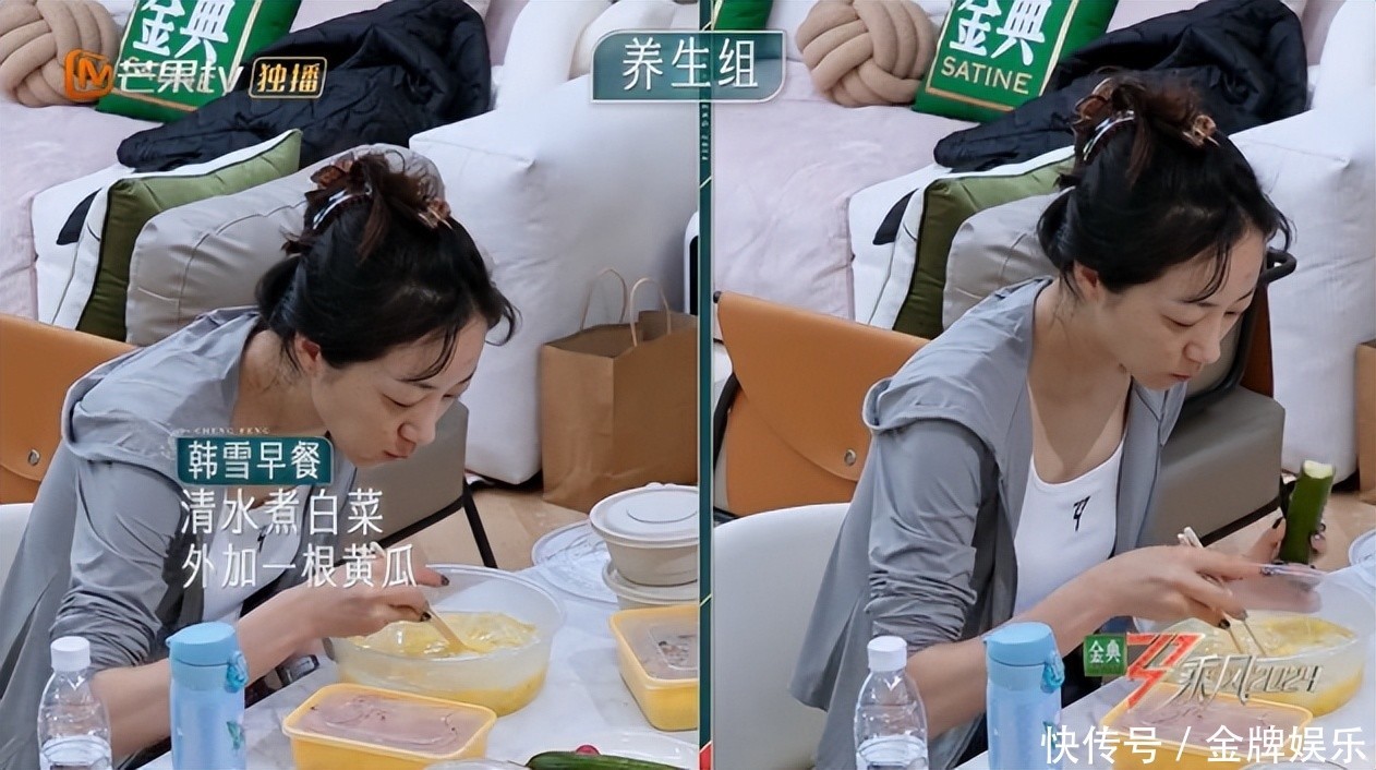 其二,可贵饮食健康。 从早餐就可以看出,两东谈主都是秉着轻饮食的理念。Joyce的早餐中,混搭了酸奶、枸杞、生果、坚果。而韩雪就更浅近了,一碗净水煮白菜,再加一根黄瓜。 要说节目组亦然很懂了,径直给两位姐姐冠上了“养生组”的头衔。