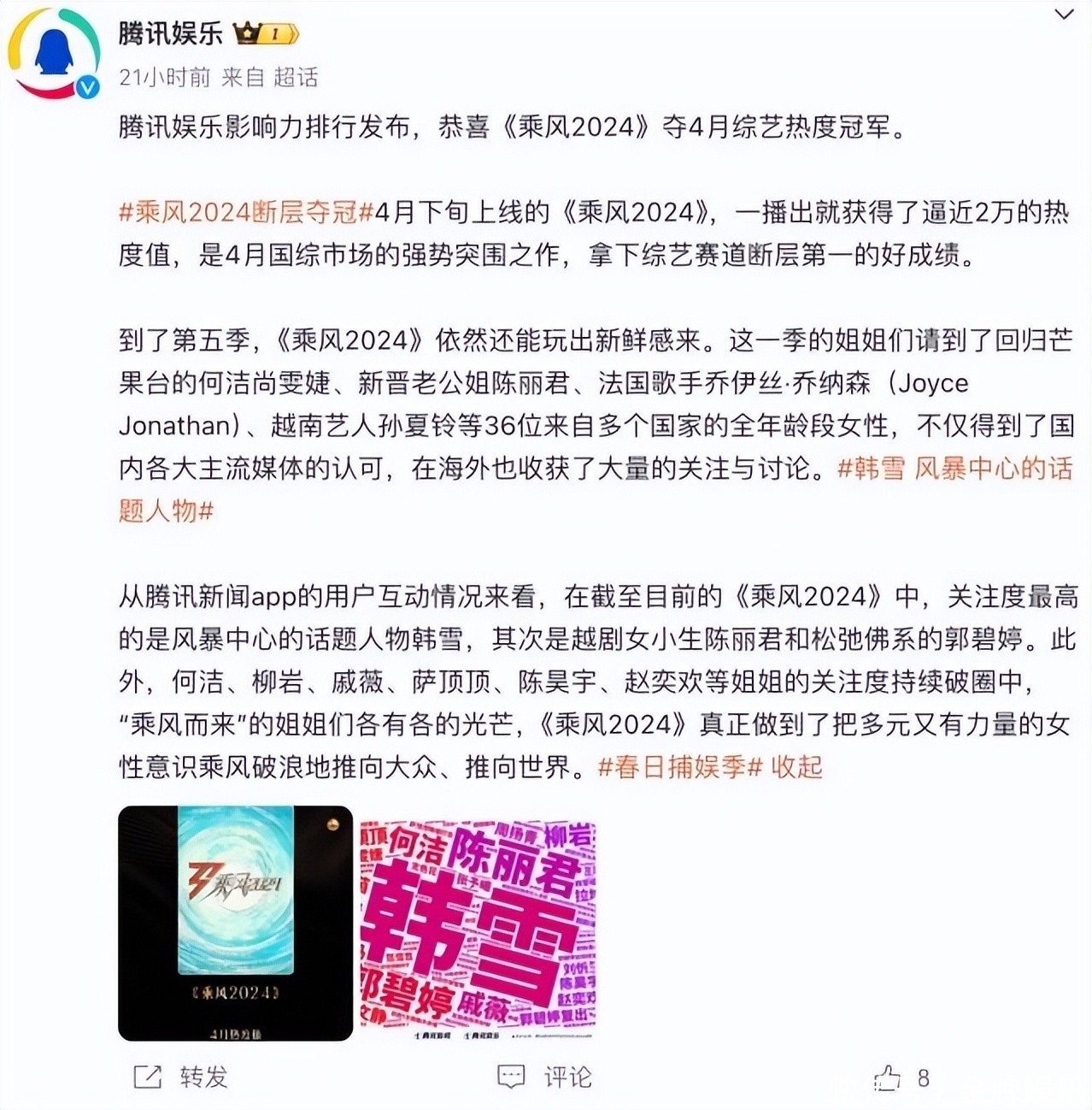 当作名副其实的国民级综艺HB火博体育网址,《浪姐》开播4季以来,碰到过巨额质疑声,但网友们耐久怀有对下一季的存眷与期待。 近日,腾讯文娱发布影响力排名,其数据标明,《浪姐5》一播出,就得回了近2万的热度值,见效拿下4月综艺热度冠军的好得益。而在来自多个国度的36位姐姐中,关注度最高的是韩雪,其次是陈丽君和郭碧婷。