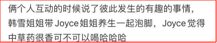 还有网友爆料称,两东谈主互动方法时,说了互相发生的兴致兴致的事情。韩雪带Joyce一都泡脚,Joyce以为中草药很香,还念念来上一口,亦然被可人到了。