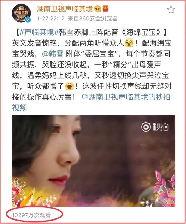 恰是因为这份自律和学习能力,在她跨界插足《声临其境》时,咱们才看到了她的配音魔力。 贝博色碟一段给《海绵宝宝》动画的配音,从英文发音到配音能力,两个扮装退换自如,韩雪得到了一致确定。这段两分钟的配音,那时在微博上有一亿的播放量。